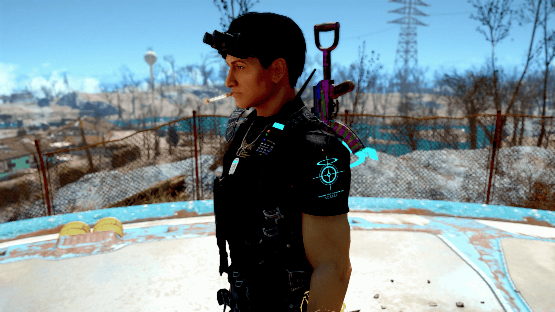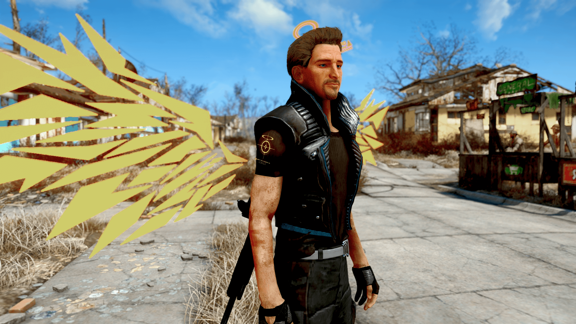 因みにこちらのMODは男女兼用と最初からなってるからFO4Editでわざわざ男性にも使えるようにしてと設定する手間は省けますが、肩のエンブレムだけは男性の腕が太いせいで隠れてしまうので、位置調整が必要になりますね。Outfit Studioで調整すればこんな感じに表示されます。