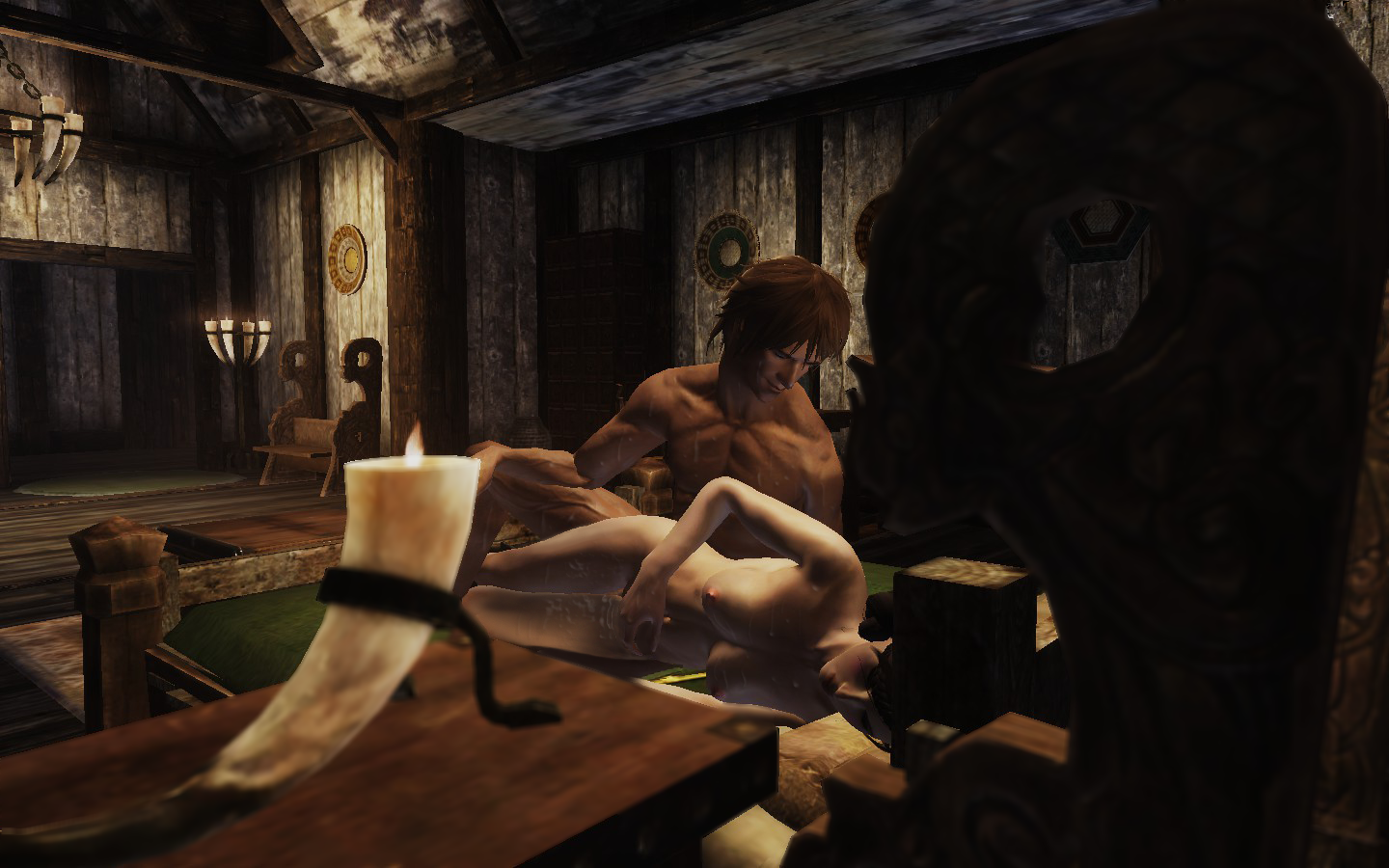 ……しばし、ぱちぱちと薪が爆ぜる音のみが室内に響く。互いに黙っていたが、調理鍋に入れておいた水が沸騰してお湯になったのを確認した所で、俺は立ち上がって壁に設けてある棚からミードの瓶を二つ取り出し、予め瓶の蓋を外してから沸騰している鍋に瓶ごと立てるようにして入れた。