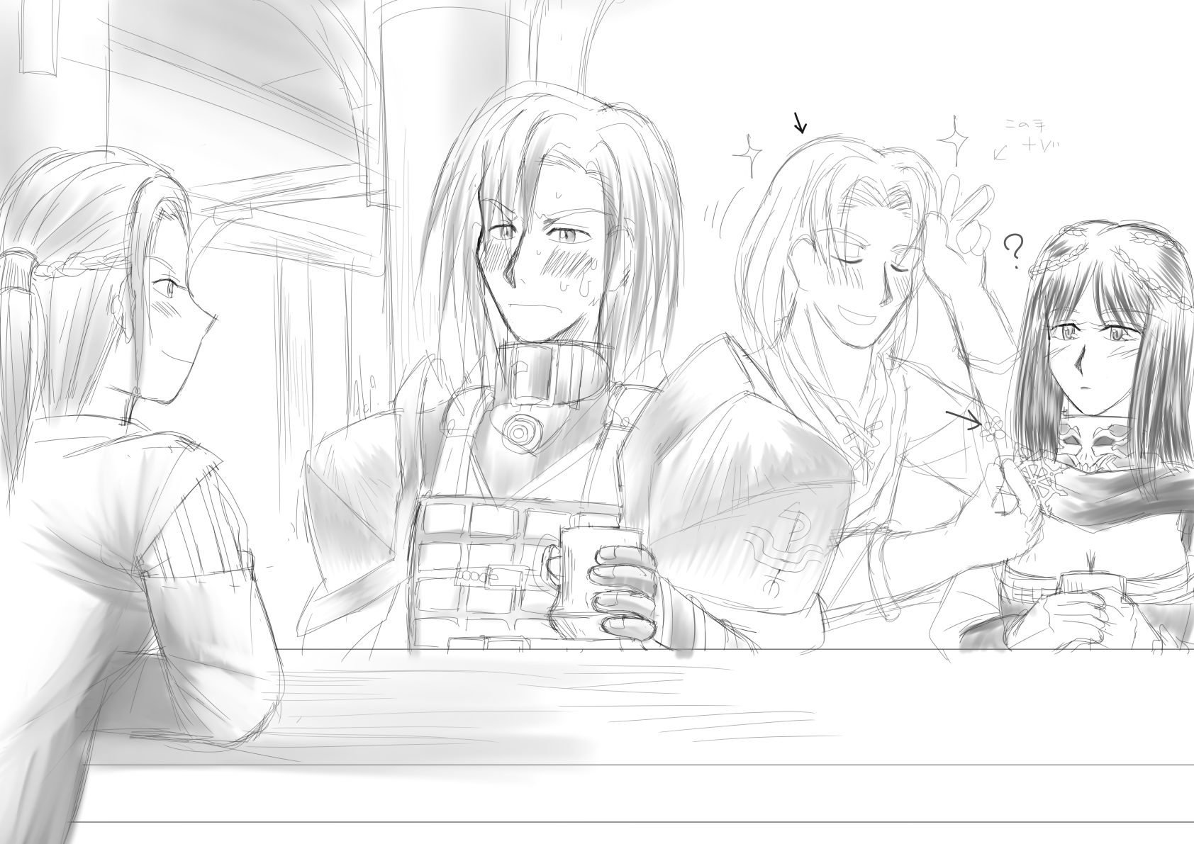 どきっとした。セラーナに聞こえてやしないか思わず彼女の方を見やるも、セラーナは相変わらず気だるそうな態度で、フルダから手渡されたミードのジョッキを両手で持ってちびちび立ち飲みしているだけだった。聞こえなかったようだ……やれやれ。