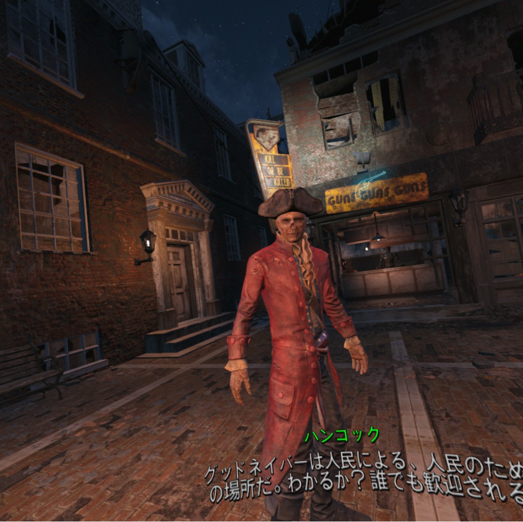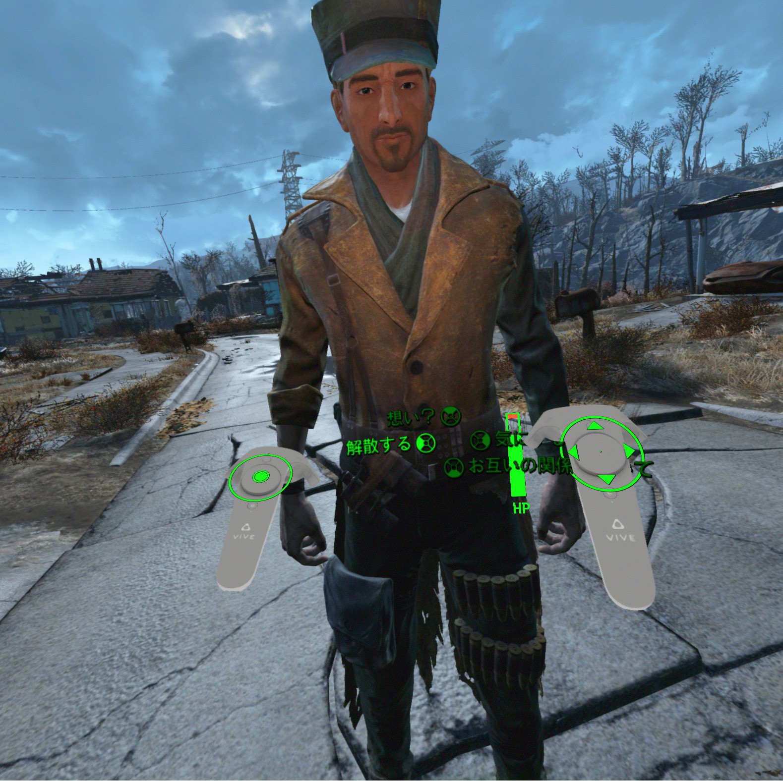 FO4VRはテレポート移動(ファストトラベルではないです)と自由移動があり、テレポートはある程度先にコントローラー向けてトリガー引くとその先に飛ぶ、という形ですが、自由移動は本来のゲームと同じく普通に移動します。走ることも可能ですが自分の足は全く見えない上に影も表示されません(これには笑った)。最初はテレポ移動でやってましたけど自由移動やりはじめたら、ちょっと3D酔いしました・・というか初日はコミケの疲れもあったから、相当眩暈がしましたしやるべき体調ではなかったんですけどやりたくて無理やりやったら吐き気を催す事態まで発展(笑)