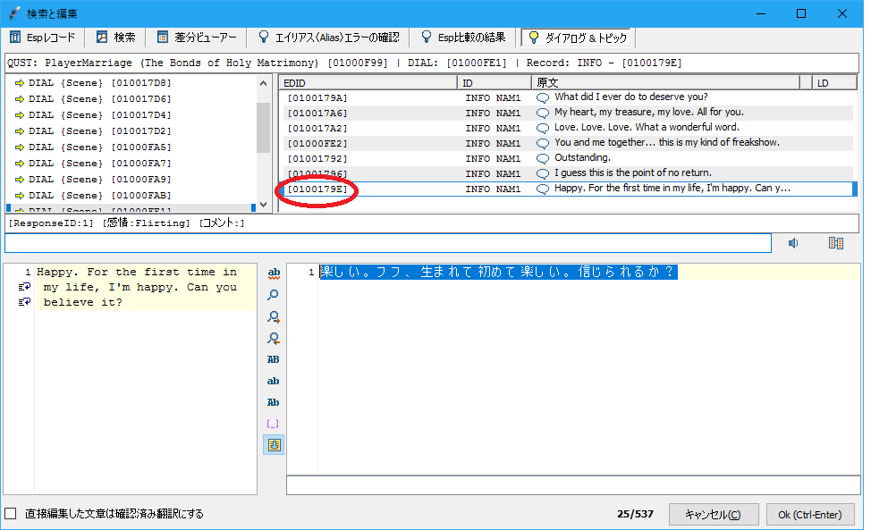 エディターIDという部分、赤く〇囲みしている箇所が、音声ファイルのファイル名です。(別にダブルクリックしなくても最初の画面にも表示されてますが、原文がわからない人はこのやり方をすれば、原文と日本語文章を照らし合わせてみることもできるので)