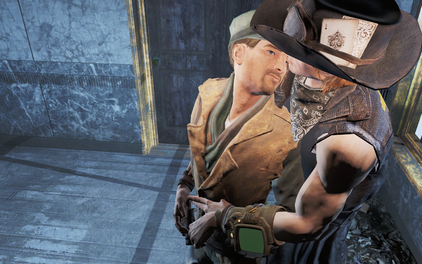 で、そのクエの終点? の宇宙船でマクレディが壁に張り付く(NPCがそういうモーションしてるせい)ので、パパさん壁ドンするの図。