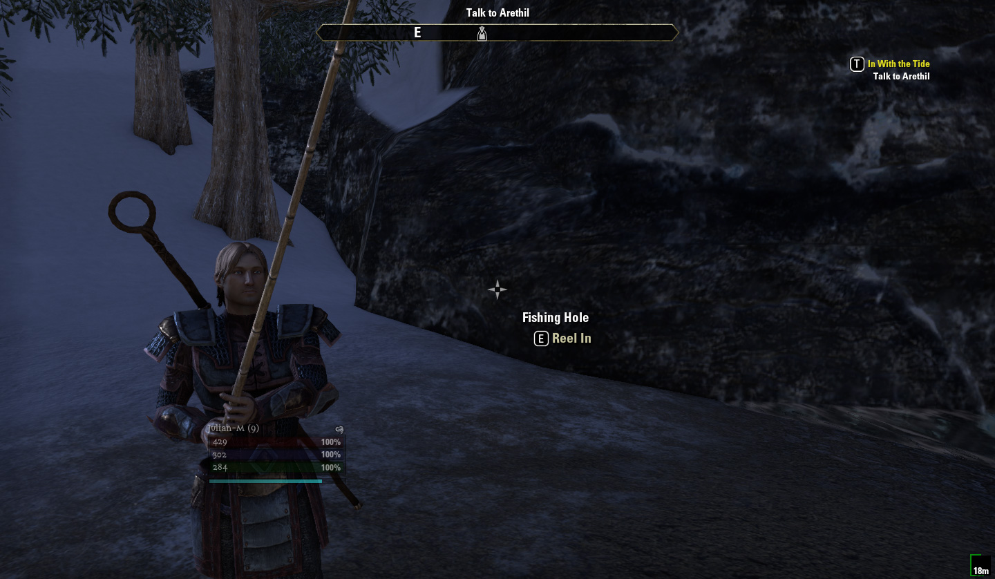 ESOはタムリエル全域で釣りがブームらしくプレイヤーは全員釣竿を常備しているらしい(笑)なので釣竿を別個用意する必要がないのが幸い。ただし餌は虫をつかまえたり時々敵を倒すと出てくるミミズを捕まえたりしないとだめだけどね。