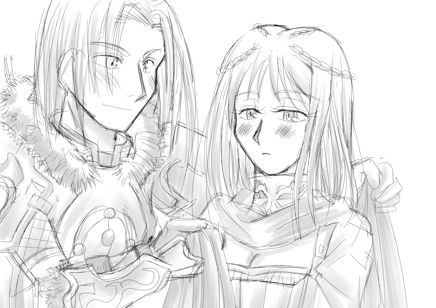 何やってるの? って思う(下手すぎて分かりにくい)でしょうが、いわゆるマントを彼女に掛けてあげようとしている感じです。ソルスセイムでもレイブンロックとスコール村は灰まみれと雪まみれの差がありますからねえ。そんなんでこんな事してもまあおかしくはないだろう、と言うことでw