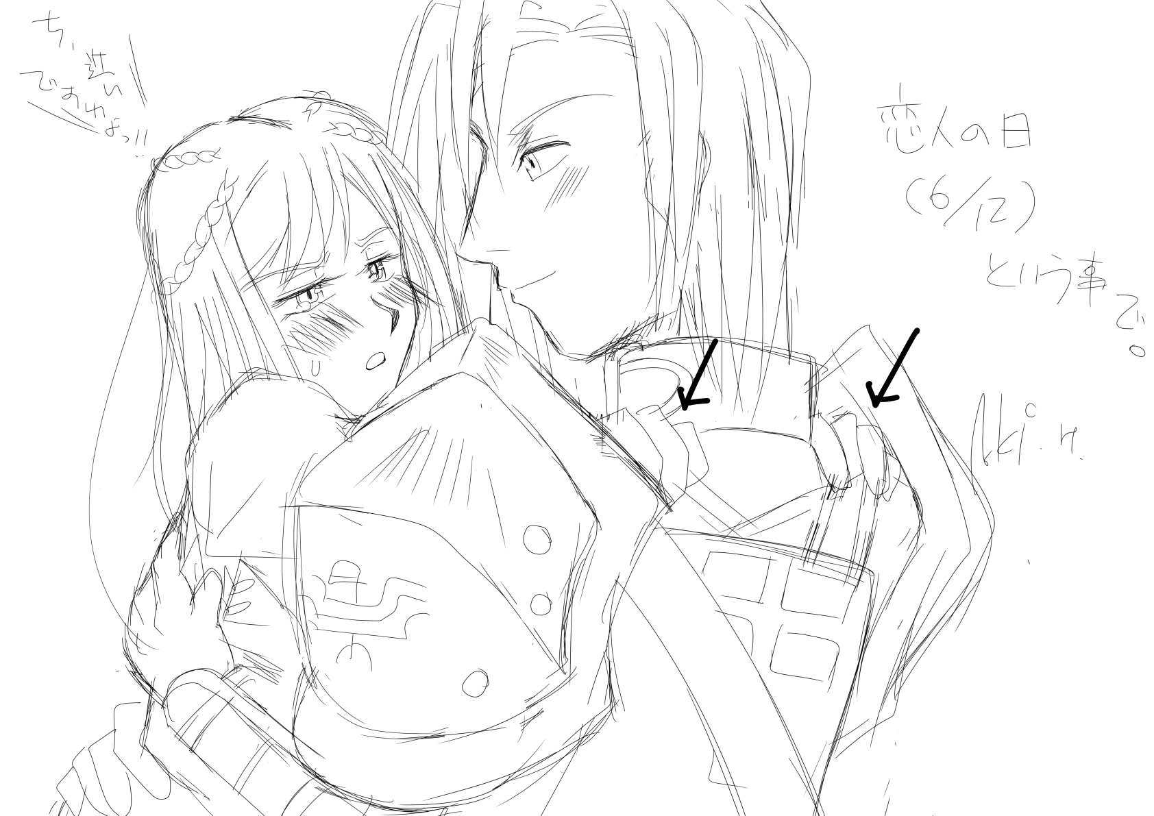 ということで今日(6/12)は巷では恋人の日、というみたいなのでこれは時間が余ったら描いてみようと思って描いてみました。ほとんど落書き同然ですごめんなさい。