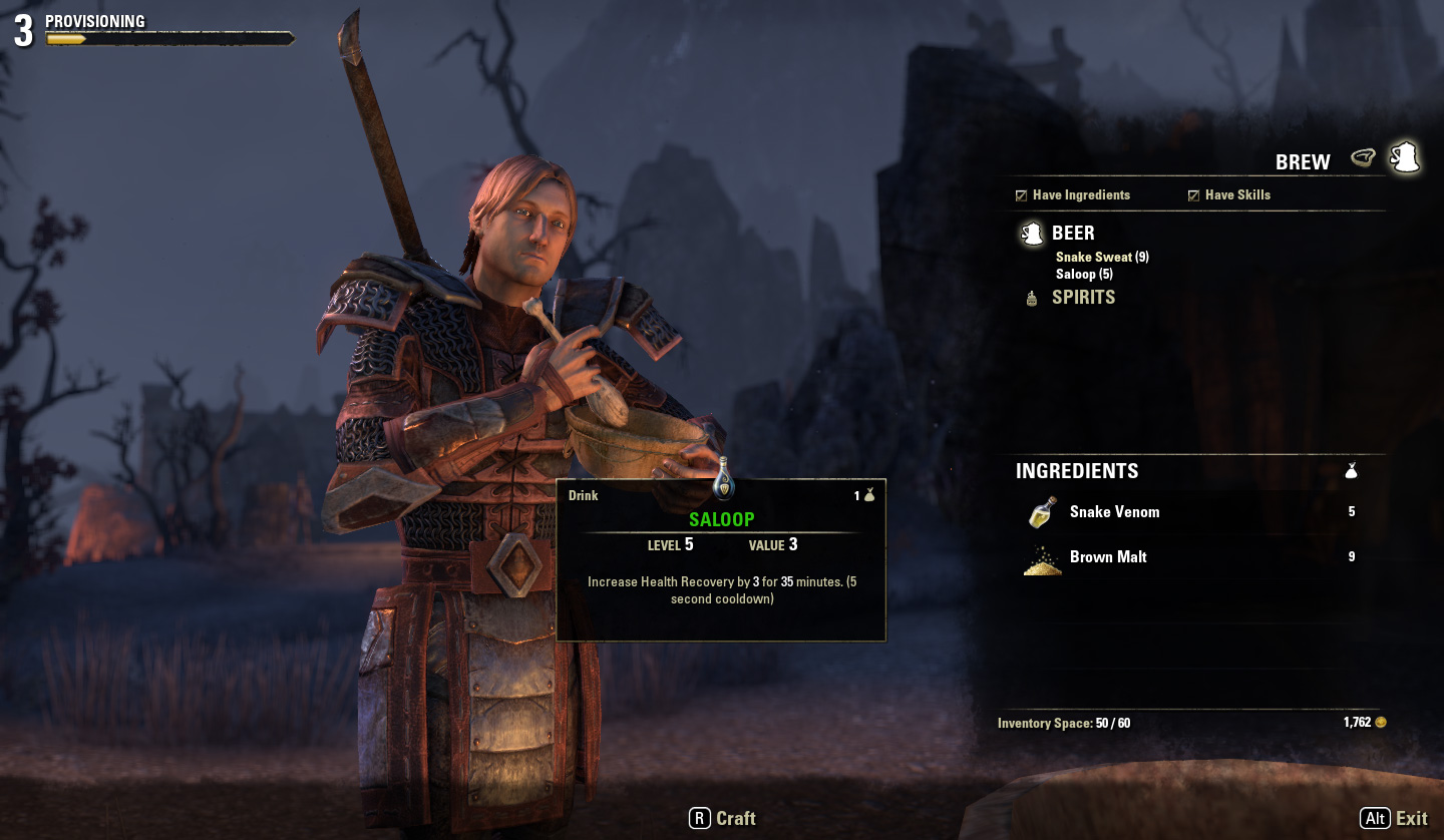 いい顔してます。何気に顔芸がよく出来てるESO。ちなみに料理は飲料と食物があって、レシピを拾うなり誰かにもらうなりして使って初めて作れるようになります。
