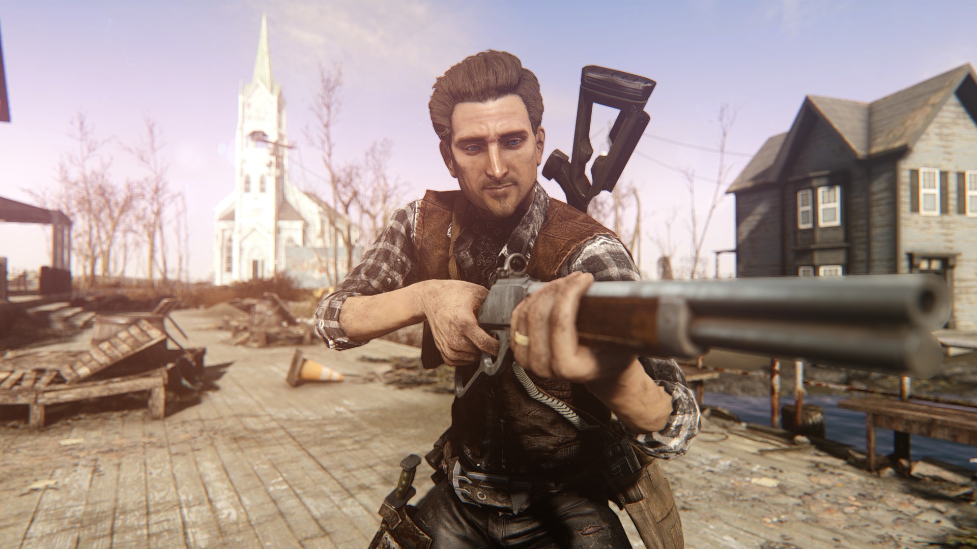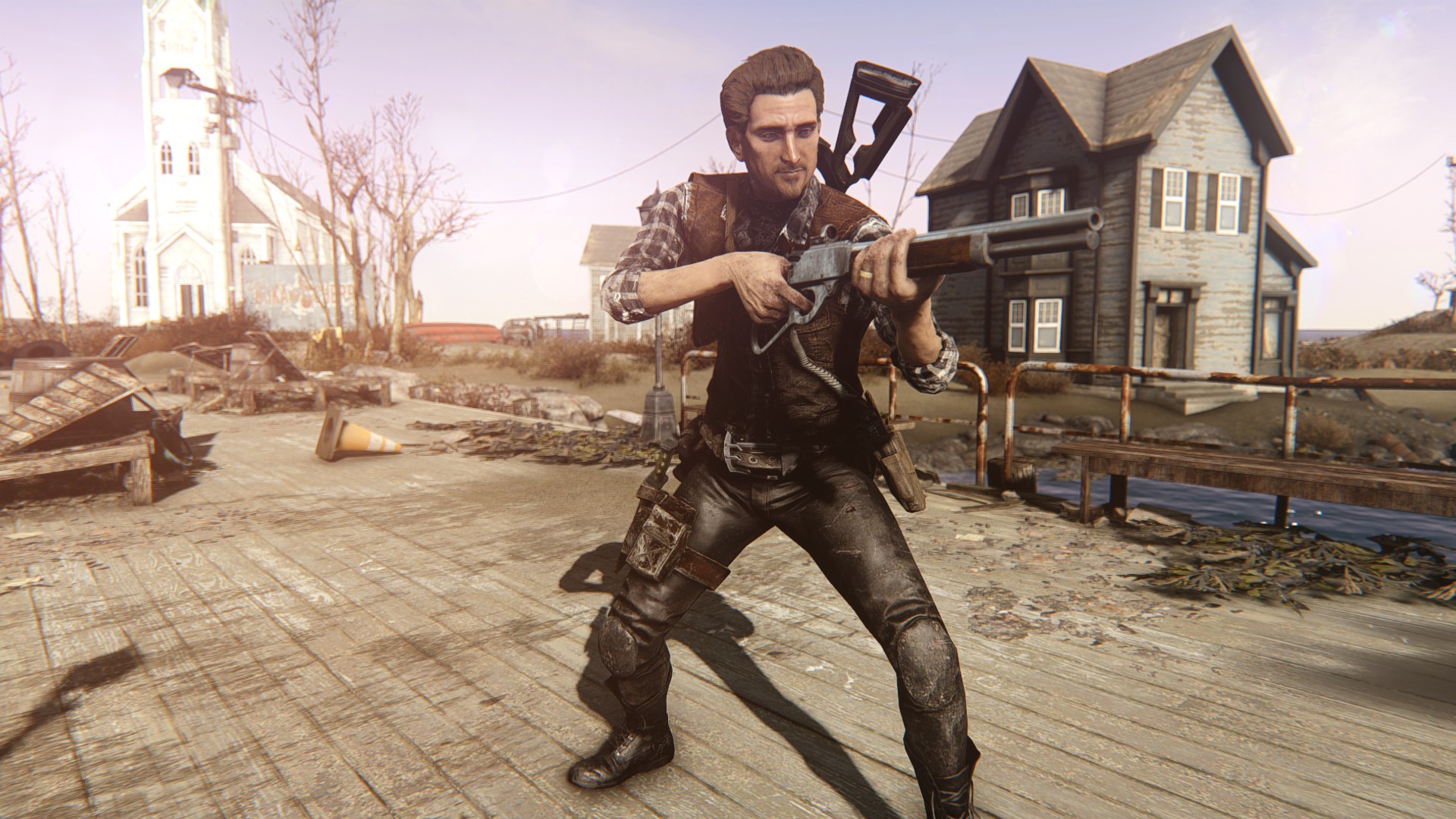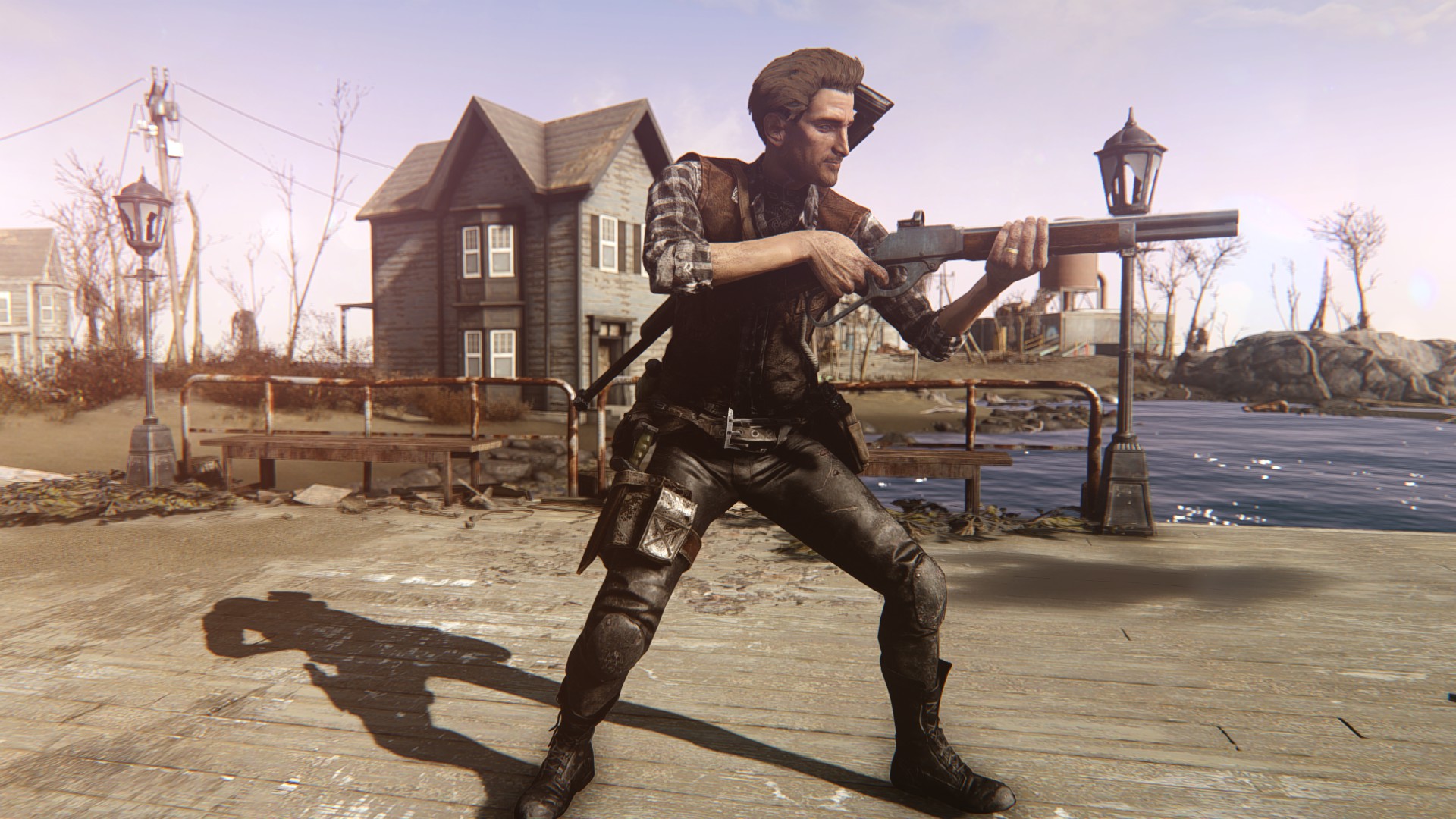 手にしてる銃はFHで追加されたレバーアクションライフルですな。俺の好みの武器の一つをマックに貸してます。背中の銃も先程紹介したホルスターMODの一つ。